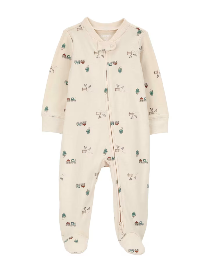 Deixe o seu baby ainda mais fofinho com o Macacão bebê com pezinho fazendinha bege | Carter's. Feito de algodão, o macacão possui zíper inverso, martingale para proteger os dedos de seu baby, gola em ribana canelada e manga longas. A estampa de fazendinha é um detalhe a parte que traz ainda mais charminho para a produção de seu pequeno. Aposte!